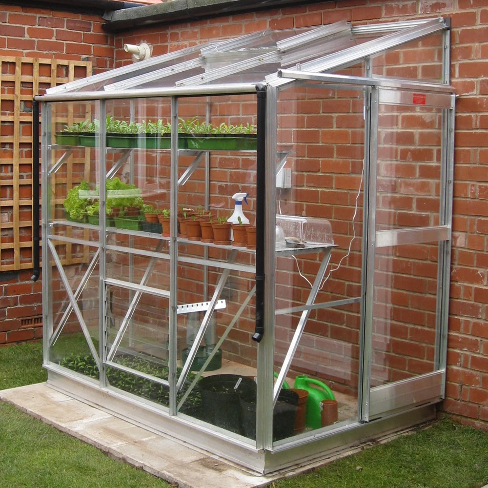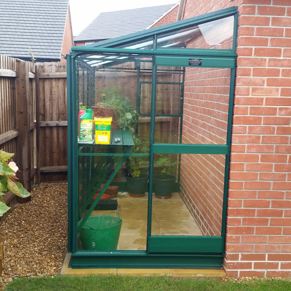 – access is via the 2′ (600mm) wide & 5’3″ (1600mm) high single sliding door, which can be fitted to either end of the lean-to during assembly.ÂDiamond Shelving – made from extruded aluminium & with the same finish as the lean-to, you receive sufficient to fit down the length of the lean-to. It is two slats wide, 7″ / 19cm wide, 8″ / 22cm from the glass.