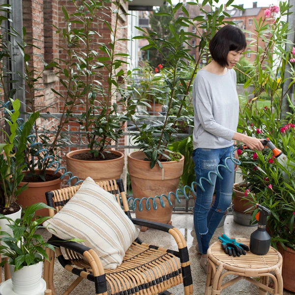 This Spiral Hose Set is ideal for watering plants on terraces and balconies or for watering smaller areas such as front gardens. It eliminates the need to unroll and roll up the hose or carrying watering cans.Â