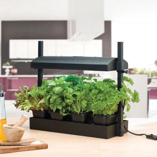 An adjustable canopy – fitted with high efficiency, high output, full spectrum (6400K) grow lights. (A single fitting with the Micro unit and a twin fitting with the standard unit) These lights use less power than a standard light bulb and provide 10,000 hours of use. Nanotech reflectors reduce heat build-up and maximise performance by reflecting 100% of the light towards the plants.