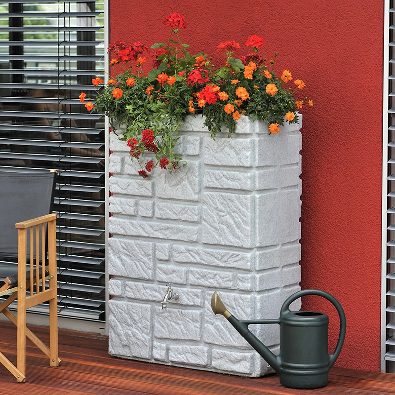 Supplied complete with a ¾in metal tap – the colour of the tap varies depending on which coloured water butt you select – a chrome tap is supplied with the granite and charcoal coloured water butts, a brass tap with the sandstone water butt.