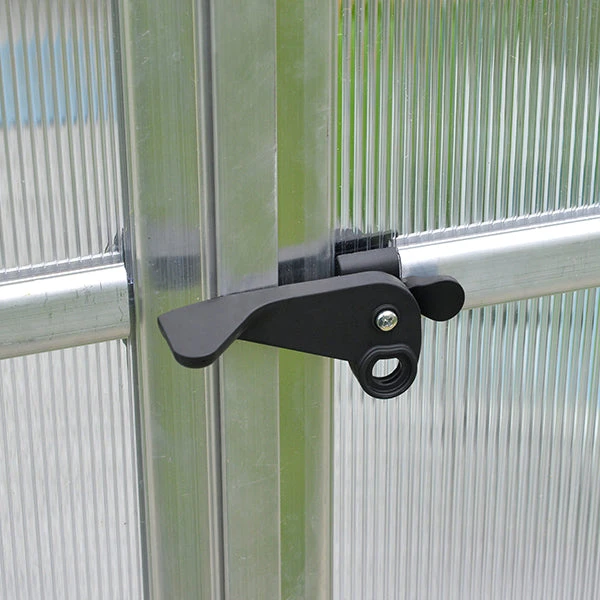 Easy Access – with a low-threshold and wide hinged double door (glazed with 4mm twin-wall polycarbonate) with magnetic door catch and lockable door handle for extra protection and safety (lock not included.)