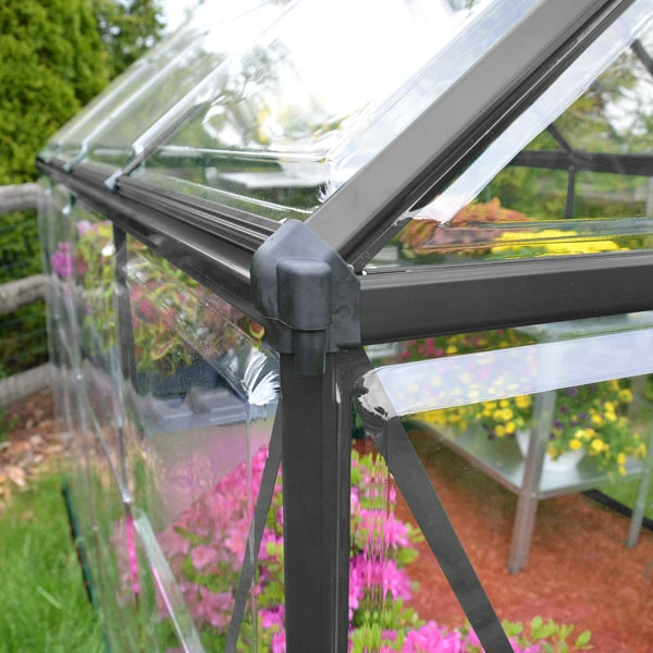 Galvanised Steel Base With Matching Grey Finish – this factory-made, rust-resistant, base will add structural stability to the greenhouse. This base can be anchored to a solid surface (such as concrete) using the pre-drilled holes in the base or it can be fitted to bare earth (fixings not included).