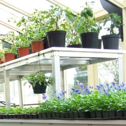 Trays – 7/8 inch deep aluminium trays (made from 1mm thick sheet) sit in the supporting framework. The trays are reversible, you can use them as a dished gravel tray or turn them over to form a flat level surface, ideal for capillary watering. Alternatively you can remove one or all of the trays to allow tall plants to be grown through the framework, which they can use for support.