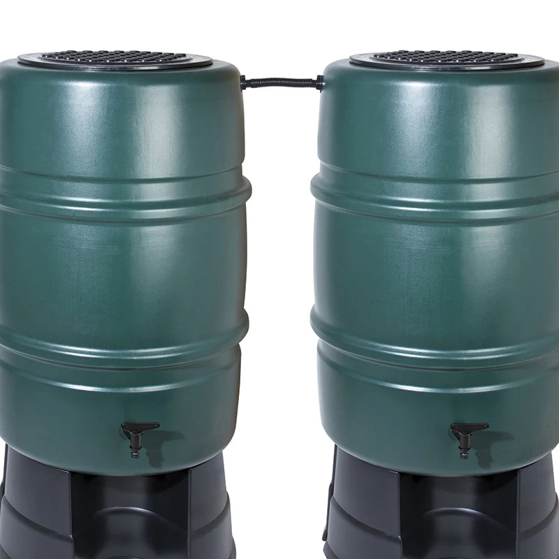 The water butts can be connected at the bottom – then the two water butts will fill at the same rate, or if the water butts are connected at the top (as shown) – then the first water butt will be filled to that level and then run over into the second water butt.Â